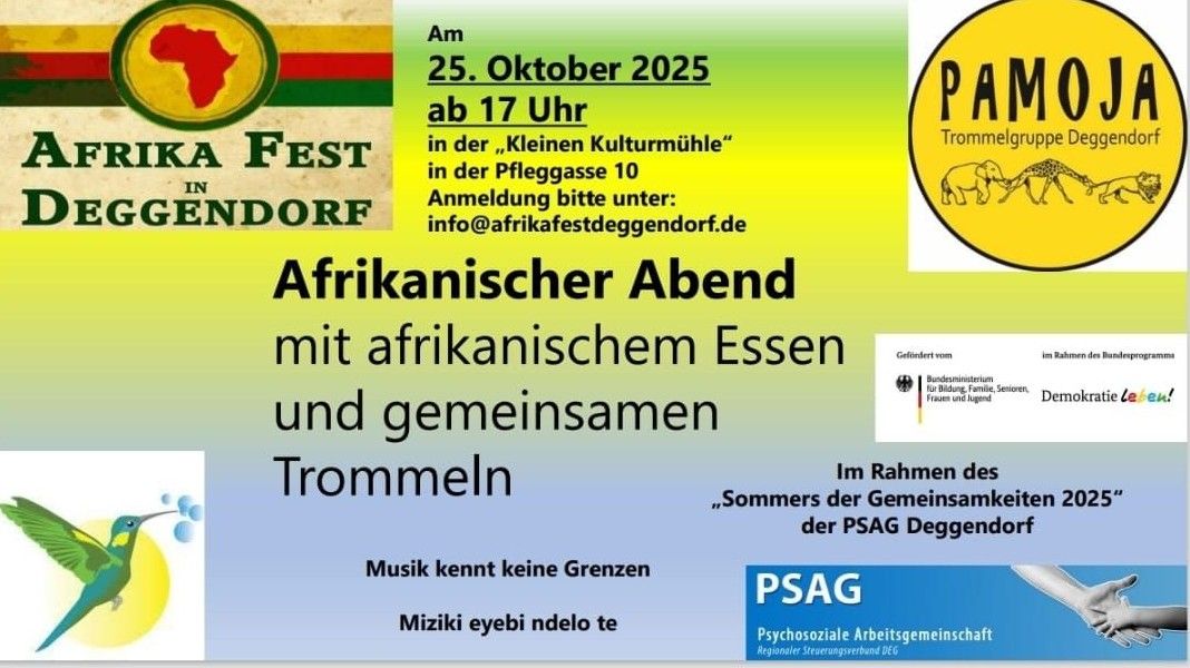 Menschen aller Nationalitäten, sollen bei Musik und Essen zusammenkommen. Die Trommelgruppe Pamoja lädt alle ein zum Mittrommeln und Mittanzen. Die Veranstaltung fördert den Austausch der Kulturen und stärkt das Gemeinschaftsgefühl in einer Stadt, die vielfältig ist.