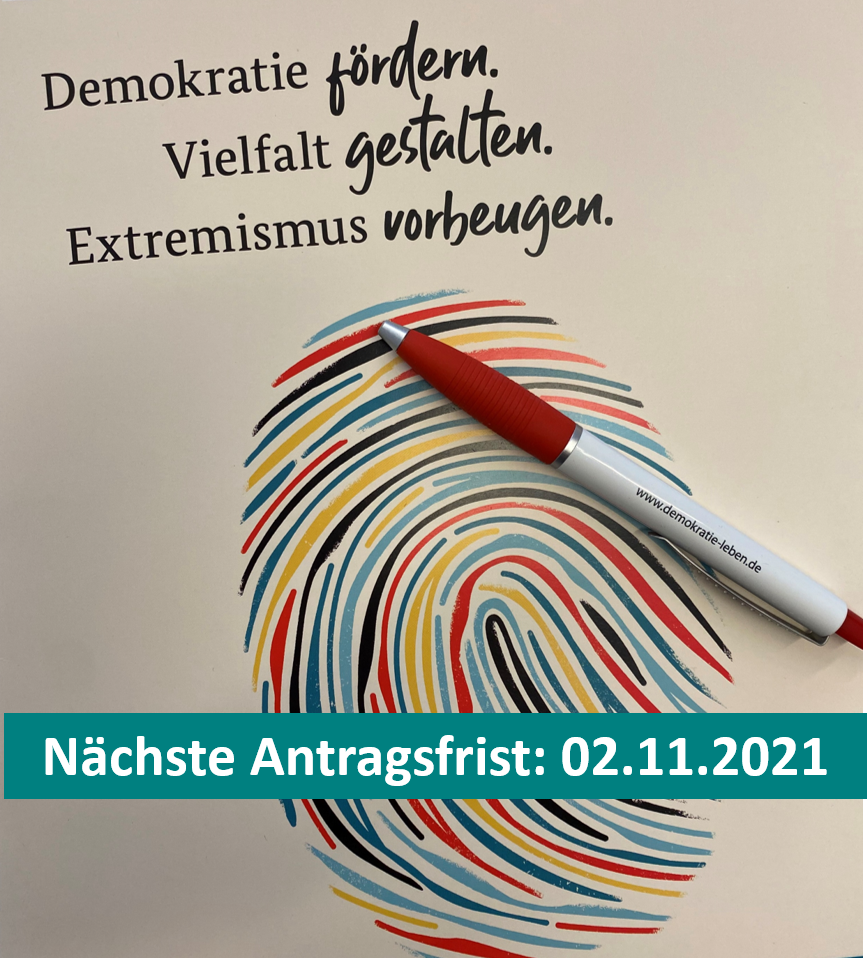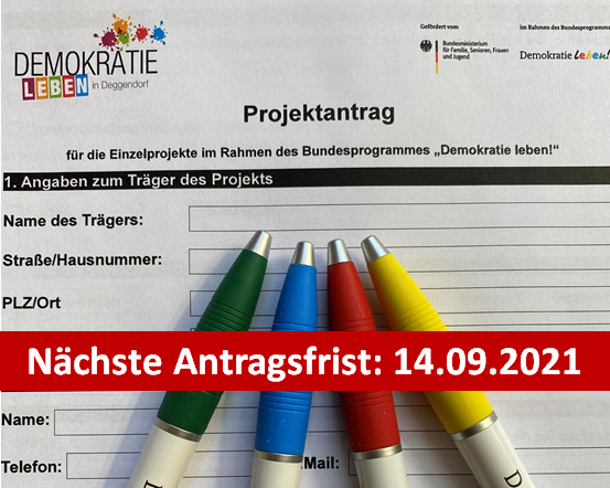 Die nächste Antragsfrist für Projekte endet am 14.09.2021. Es stehen noch Mittel für 2021 bereit, Anträge für 2022 können aber auch bereits gestellt werden. Demokratie leben! stellt Mittel für Projekte zur Demokratieförderung, Vielfaltgestaltung und Prävention von Extremismus zur Verfügung. Die Koordinierungs- und Fachstelle nimmt die Anträge entgegen, unterstützt Projektträger und Interessierte in Form von Beratung, bei der Projektentwicklung sowie bei der Antragsstellung. Kontakt: Diese E-Mail-Adresse ist vor Spambots geschützt! Zur Anzeige muss JavaScript eingeschaltet sein!. Alle Infos rund um die Projektförderung auf unserer Website: https://demokratie-leben-in-deggendorf.de. Weitere Antragsfristen folgen, mindestens eine pro Quartal