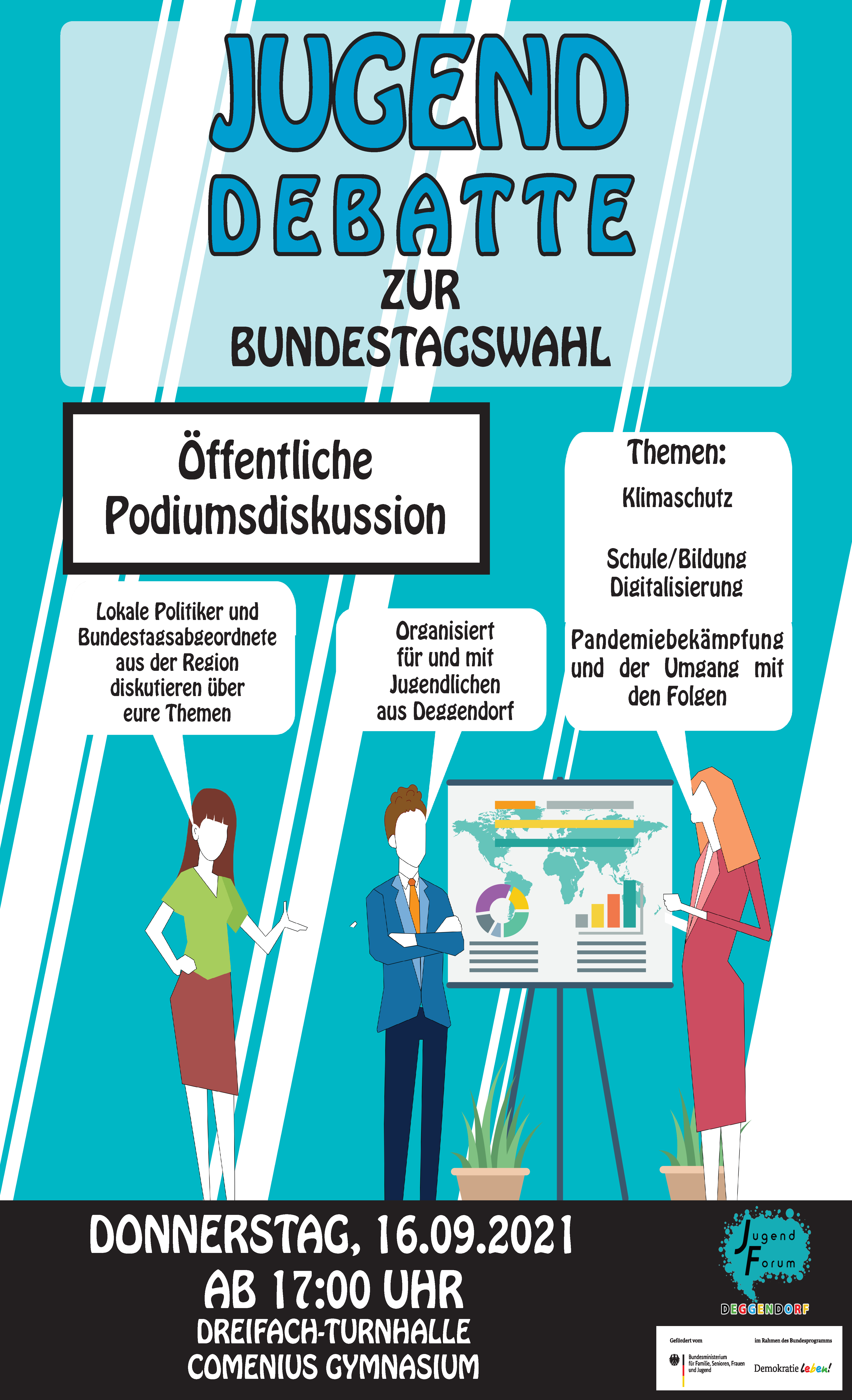 Das Jugendforum führt heuer wieder eine Jugenddebatte zur Bundestagswahl durch. Mit dabei sind Direktkandidierende aus dem Wahlkreis Deggendorf. Im Mittelpunkt stehen die Themen Klimawandel, Digitalisierung und Schulen sowie der Umgang mit den Folgen der Pandemie. SchülerInnen haben im Vorab zu diesen Themen einen Fragekatalog zusammengestellt. Moderiert wird die Diskussion von Sarah Beham vom Bayerischen Rundfunk. Eingeladen sind besonders Jugendliche, gerne aber auch BürgerInnen.