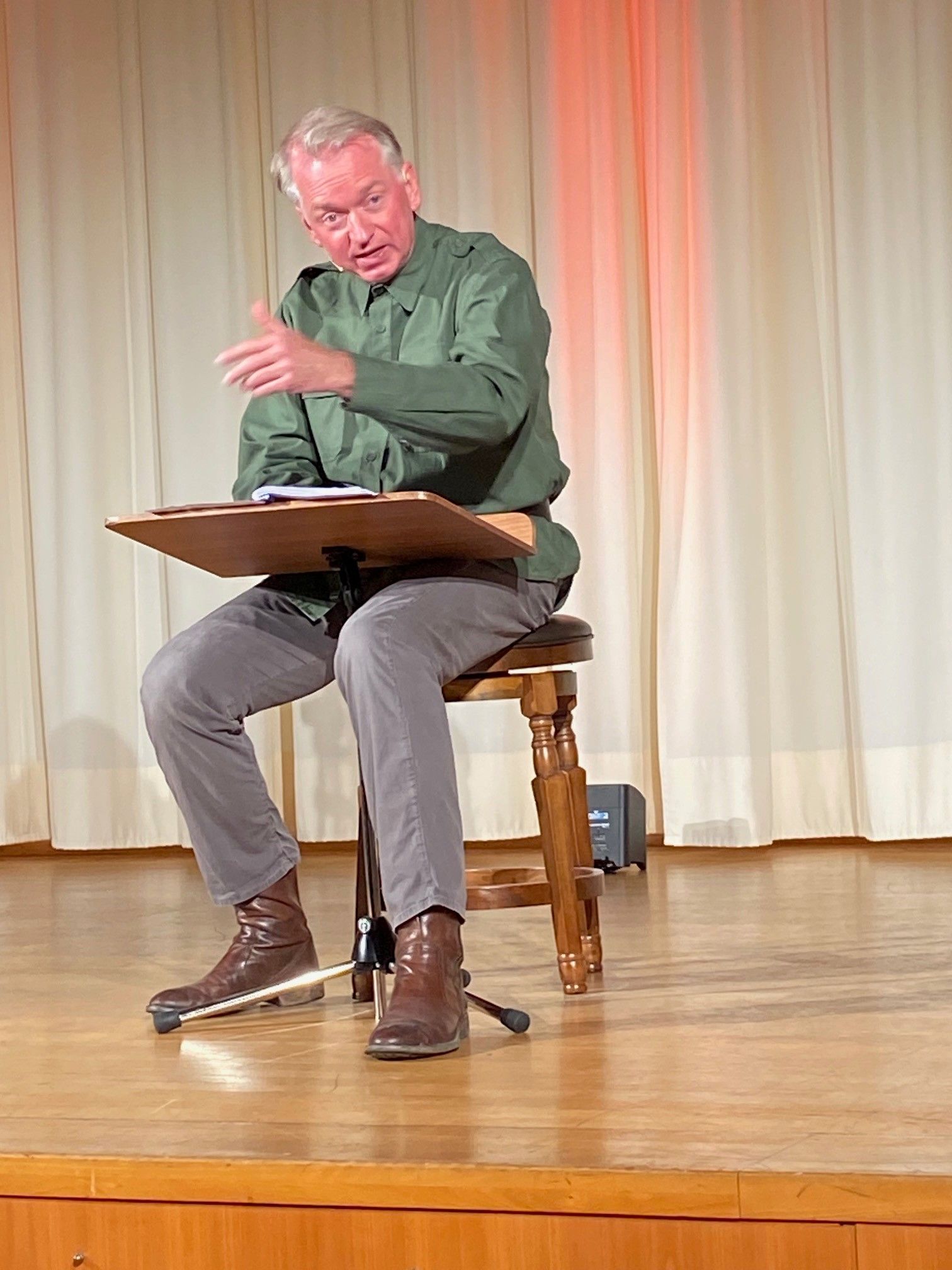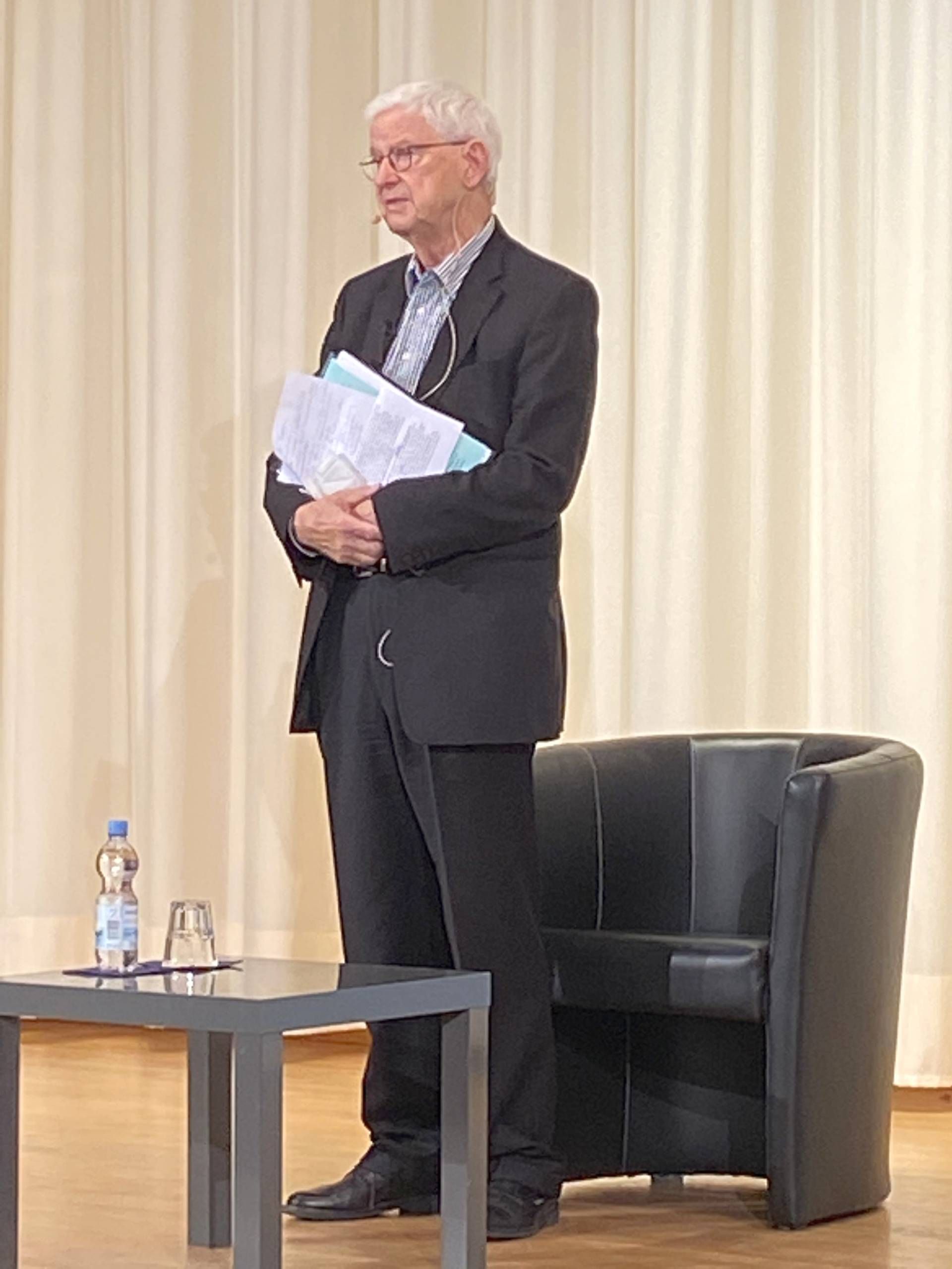 Er spricht zunächst über das Ende der DDR und die Rolle der Staatssicherheit in der SED-Diktatur und liest dann aus seinem Roman "Der Sykophant".