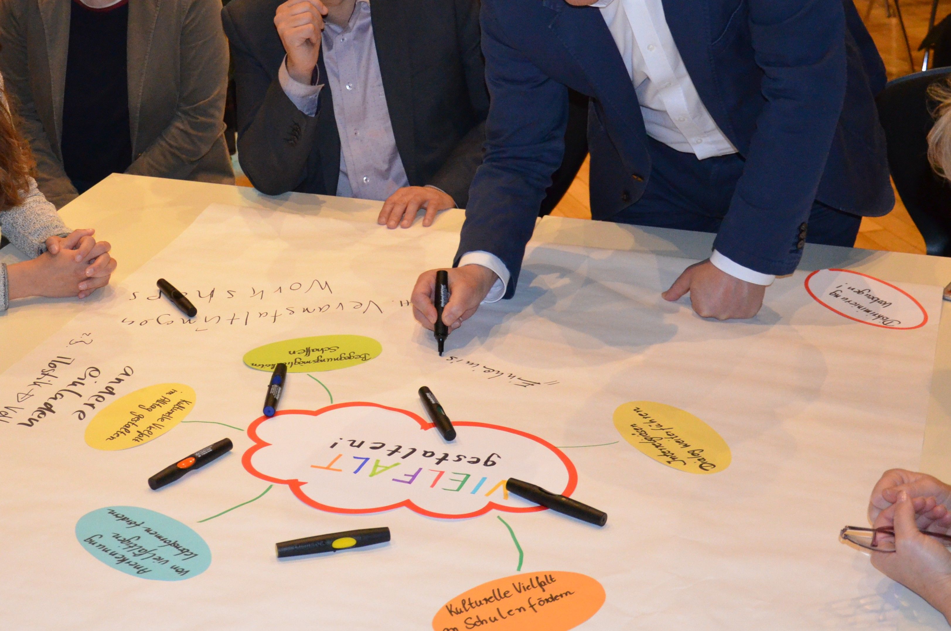 Mit der Methode Speedating sollen die Teilnehmenden mit den Flüchtlingen ins Gespräch kommen. Hierbei ist an jedem Tisch eine Moderation unterstützend tätig.