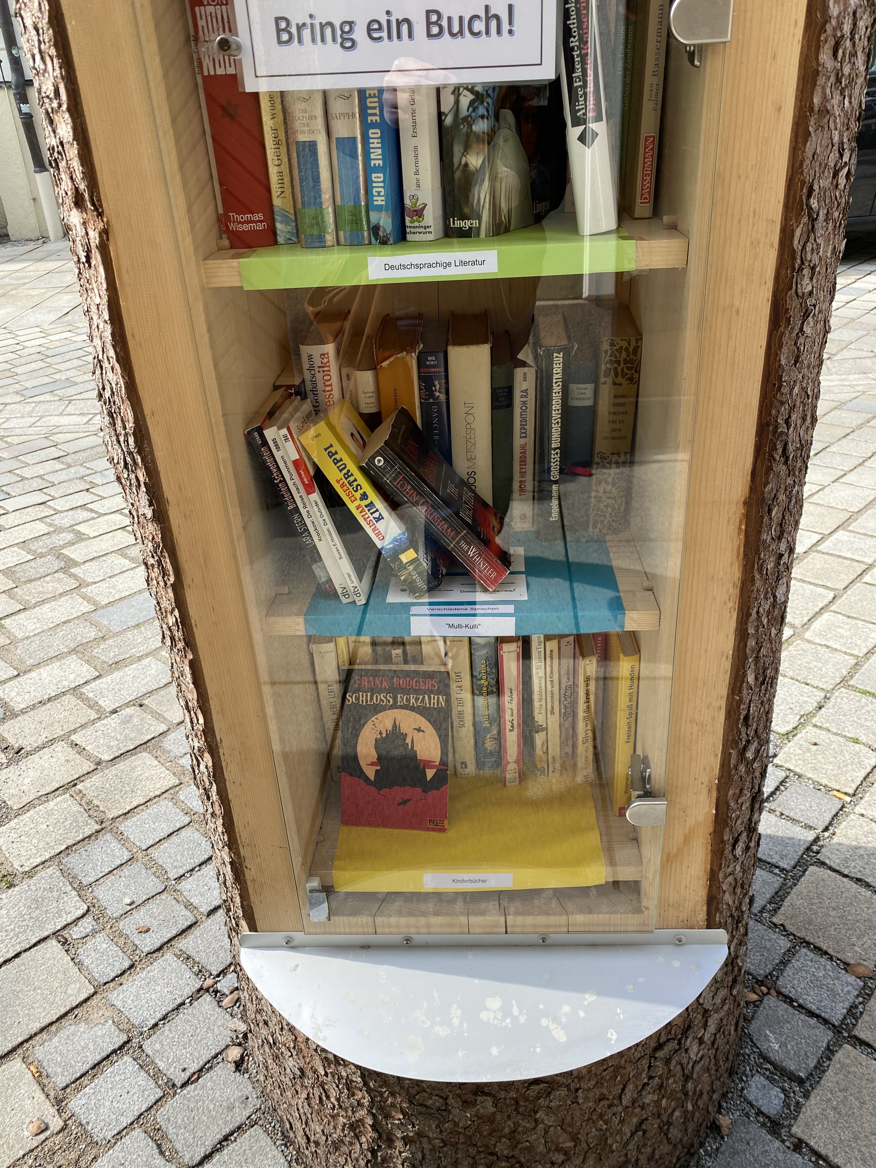 Ein Bücherbaum dient als Tauschplatz für Bücher und Literatur. Bürgerinnen und Bürger haben die Möglichkeit Bücher abzugeben und/oder sich ein Buch kostenlos und ohne jegliche Formalitäten auszuleihen. Dabei soll der Bücherbaum nicht nur Tauschplatz sondern auch Begegnungsort sein. Der Bücherbaum ist jederzeit zugänglich und ist barrierefrei. Unsere Gesellschaft ist vielfältiger und bunter geworden. Die Abteilung "Multikulti" für nicht-deutsche Literatur soll v.a. für Menschen mit Migrationshintergrund den Zugang zu Literatur in ihrer Muttersprache erleichtern. Entfernt werden Bücher über Gewalt, Extremismus, Pornografie und religiöse Werke, sowie kommerzielle oder politische Werbung.