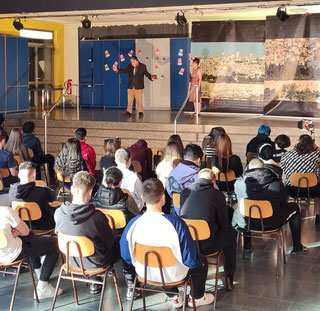 Es handelt sich um die Aufführung des "Klassikers schlechthin" "Nathan der Weise" von Gotthold Ephraim Lessing, ein Theaterangebot des Forumtheaters aus Wien. Die Aufführung findet in der Aula der Schule statt. Noch nie war dieses Stück deutscher Literatur aktueller und jetztbezogener als heute. Das Stück ist auch wegen der gekürzten Fassung leicht verständlich. Kein Tag, an dem nicht Zeitungen und Fernsehen über Auseinandersetzungen und Krieg und zum Teil verbrecherischen Taten berichten und dieses fast immer unter Einbeziehung des religiösen und kulturellen Aspektes. Diesen Berichten kann sich kein Schüler entziehen, jedenfalls nicht auf Dauer. Daher ist dieses Werk so aktuell wie nie zuvor. Auf leichte Weise wird eine Problemlösung angeboten, welche, würde sie die Politik annehmen, ein brennendes Problem des Heute lösen würde.