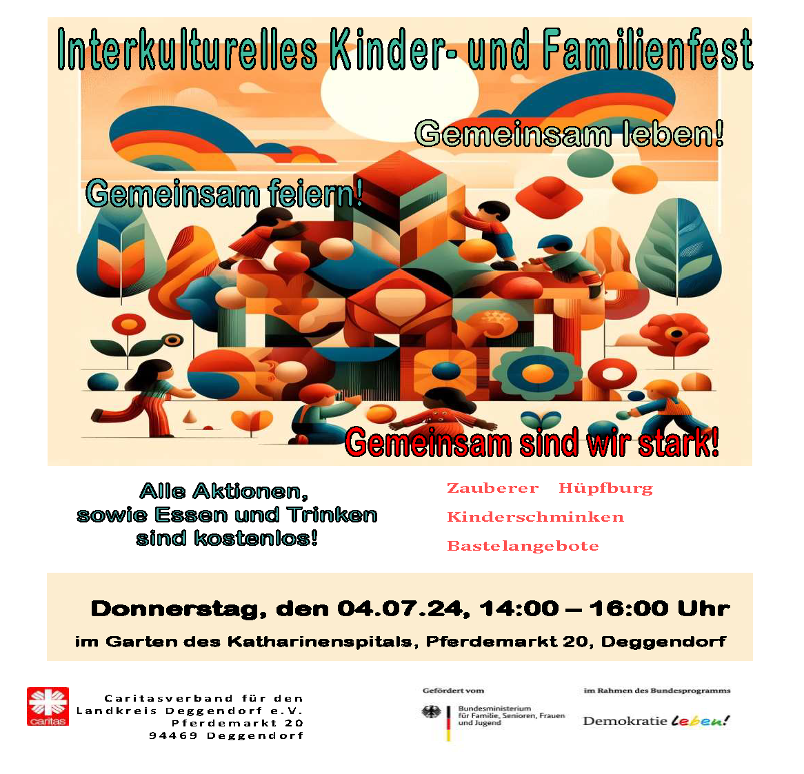 Das Interkulturelle Kinderfest ermöglicht Begegnungen vieler Kinder und Nationen um Vorurteile abzubauen, das Zusammenlebens in einer vielfältigen Gesellschaft zu fördern und ein besseres gegenseitiges Verständnis für die jeweilige Kultur und Religion zu erreichen. Jedes Kind und jede Familie ist willkommen. In den Wochen vor dem Fest wird dieses aktiv in den verschiedenen Einrichtungen, in den Grundschulen und Kindertageseinrichtungen beworben, um das Ziel der Demokratieförderung und des internationalen Austauschs zu erreichen. Alle Angebote, Essen und Getränke werden kostenlos sein um auch sozial schwachen Familien und den Bewohner*innen des Ankerzentrums in Deggendorf die Teilnahme zu ermöglichen.