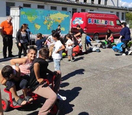 Das Spielmobil des KJR Deggendorf fährt zu mehreren Einsätzen in die Ankereinrichtungen im Landkreis. Das Spielmobil ist ausgestattet mit verschiedenen Bastel- und Malangeboten, Spielen, Bewegungsangeboten uvm. Für viele Spiele bedarf es keiner/wenig Verständigung, weshalb diese hervorragend für die Einrichtungen geeignet sind. Die Kinder sollen während der Aktionen den tristen Alltag in den Einrichtungen vergessen und einfach mal Kind sein können. Sie sollen so ihre Eindrücke verarbeiten und spielerisch neues erkunden. Durch die ehrenamtlichen Helfer:innen soll ein erster/weiterer Kontakt zu den Bürger:innen vor Ort hergestellt werden.